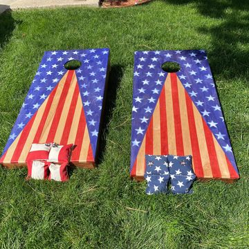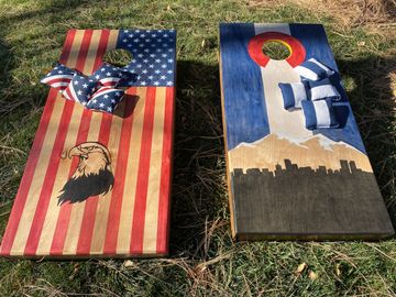Hand painted cornhole, official size 2’x 4’, it comes with pro hand made cornhole bags, score board, bag storage, drink holders and opener, made with premium pine. Customize your paint